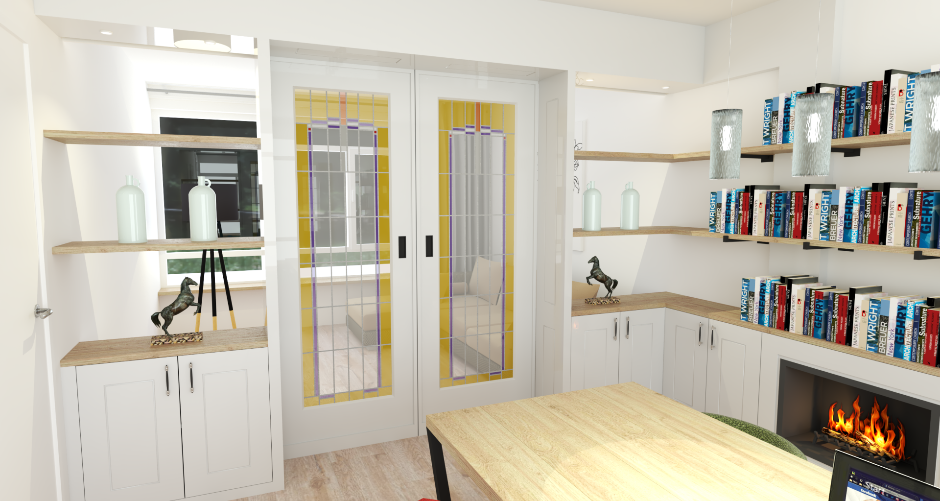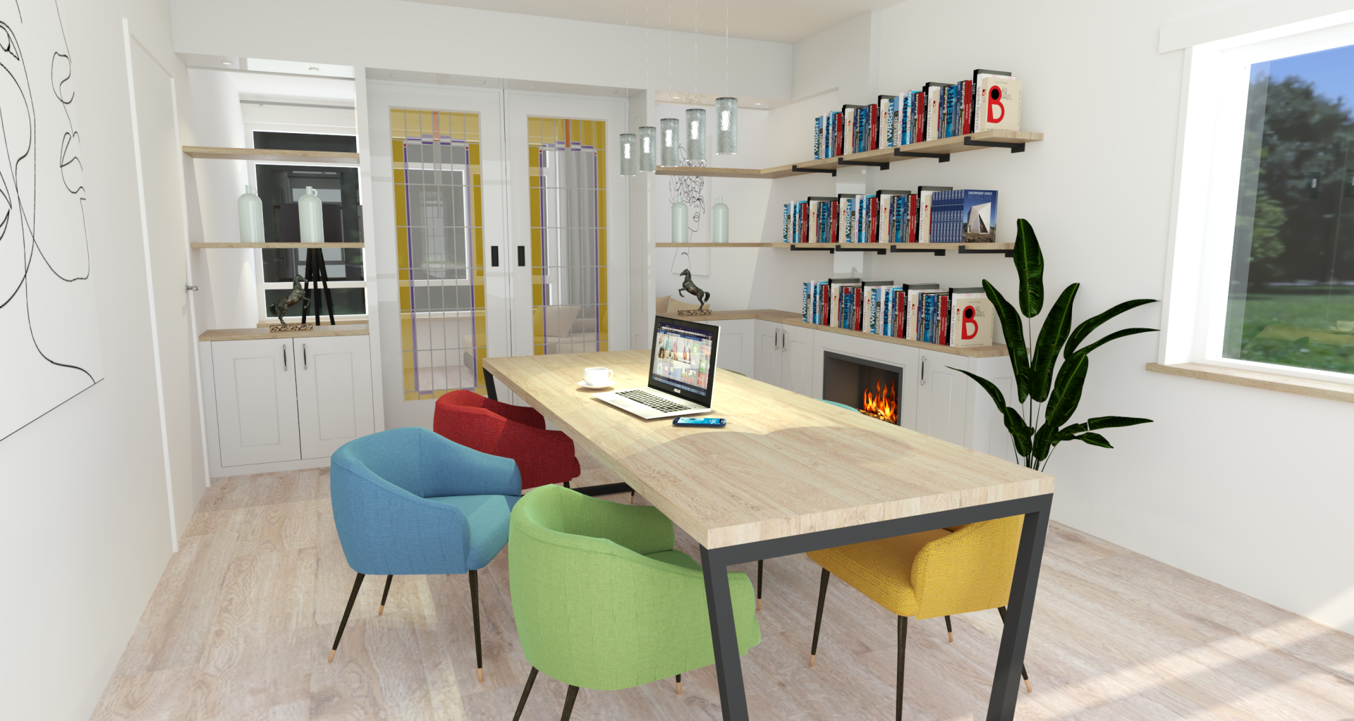 Overige wensen waren voldoende kastruimte voor mappen en boeken met een voorkeur voor een klassieke touch maar toch met een robuuste en warme uitstraling, licht. Ruimte om te ontspannen en ruimte om vrienden en familie te ontvangen aan een ruime en robuuste tafel.