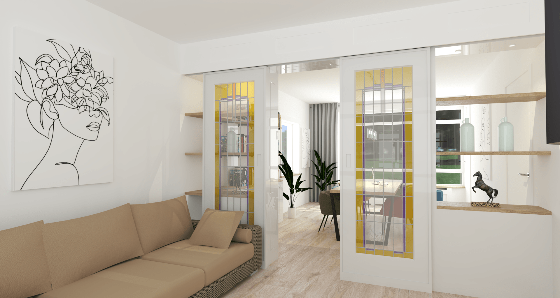 De eigenaar van dit kleine appartement kreeg twee fraaie klassieke en-suite deuren cadeau die moesten worden opgenomen in de woonkamer.