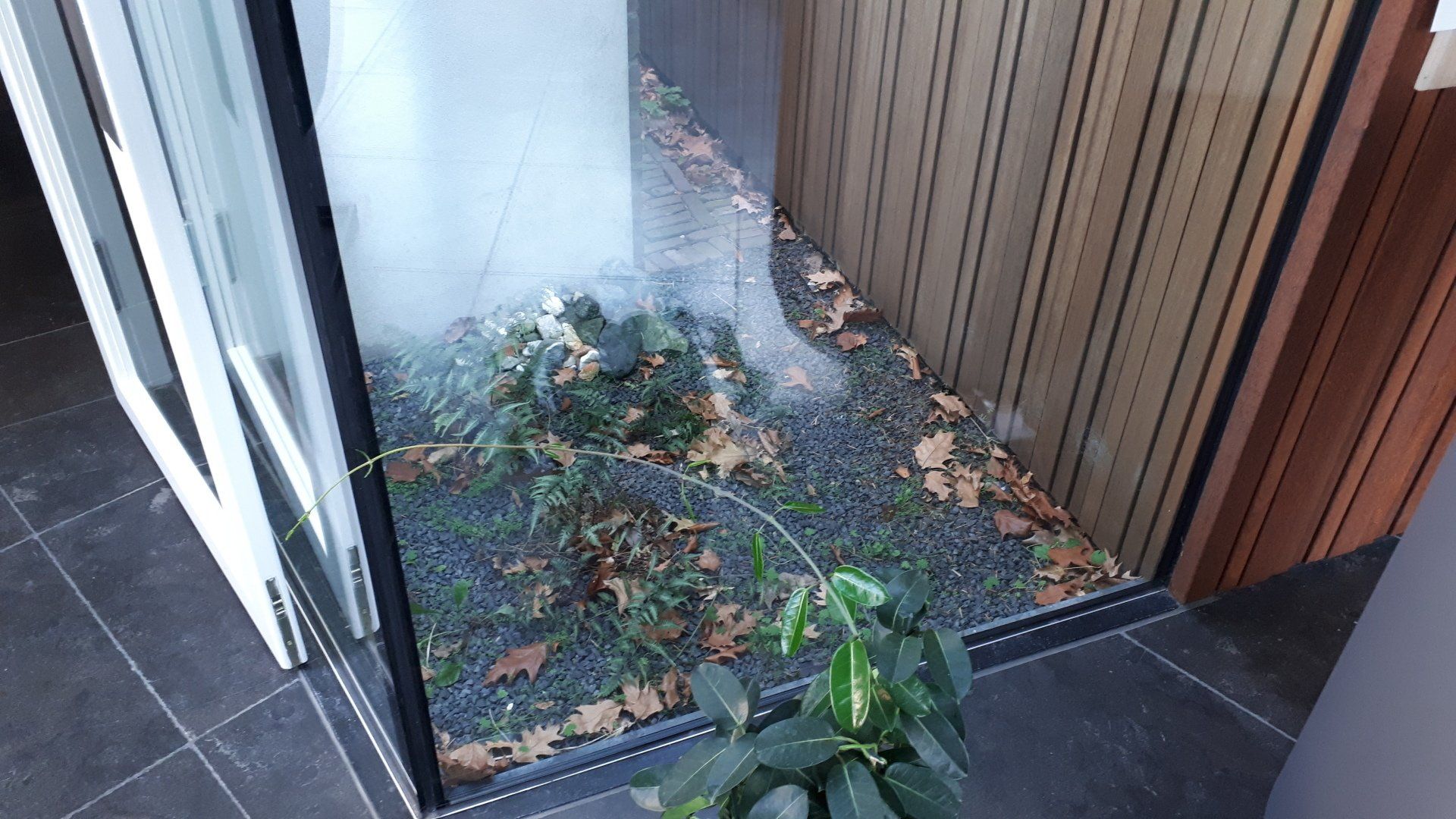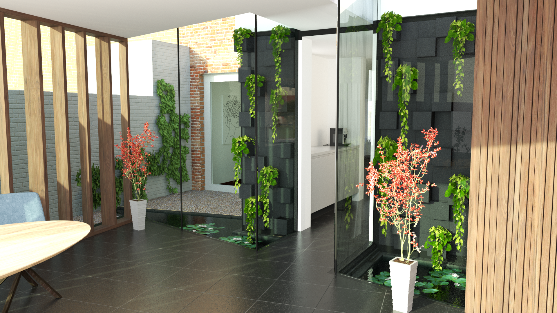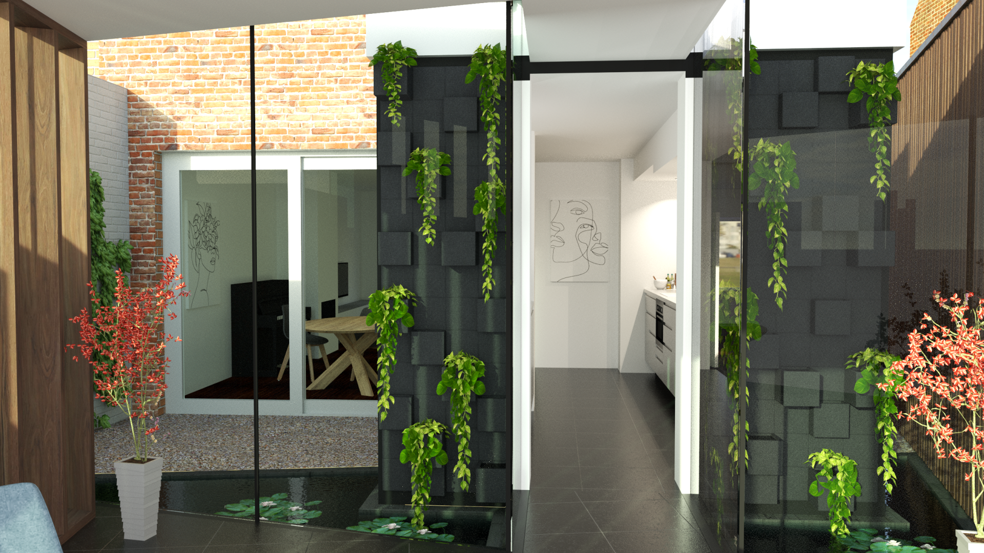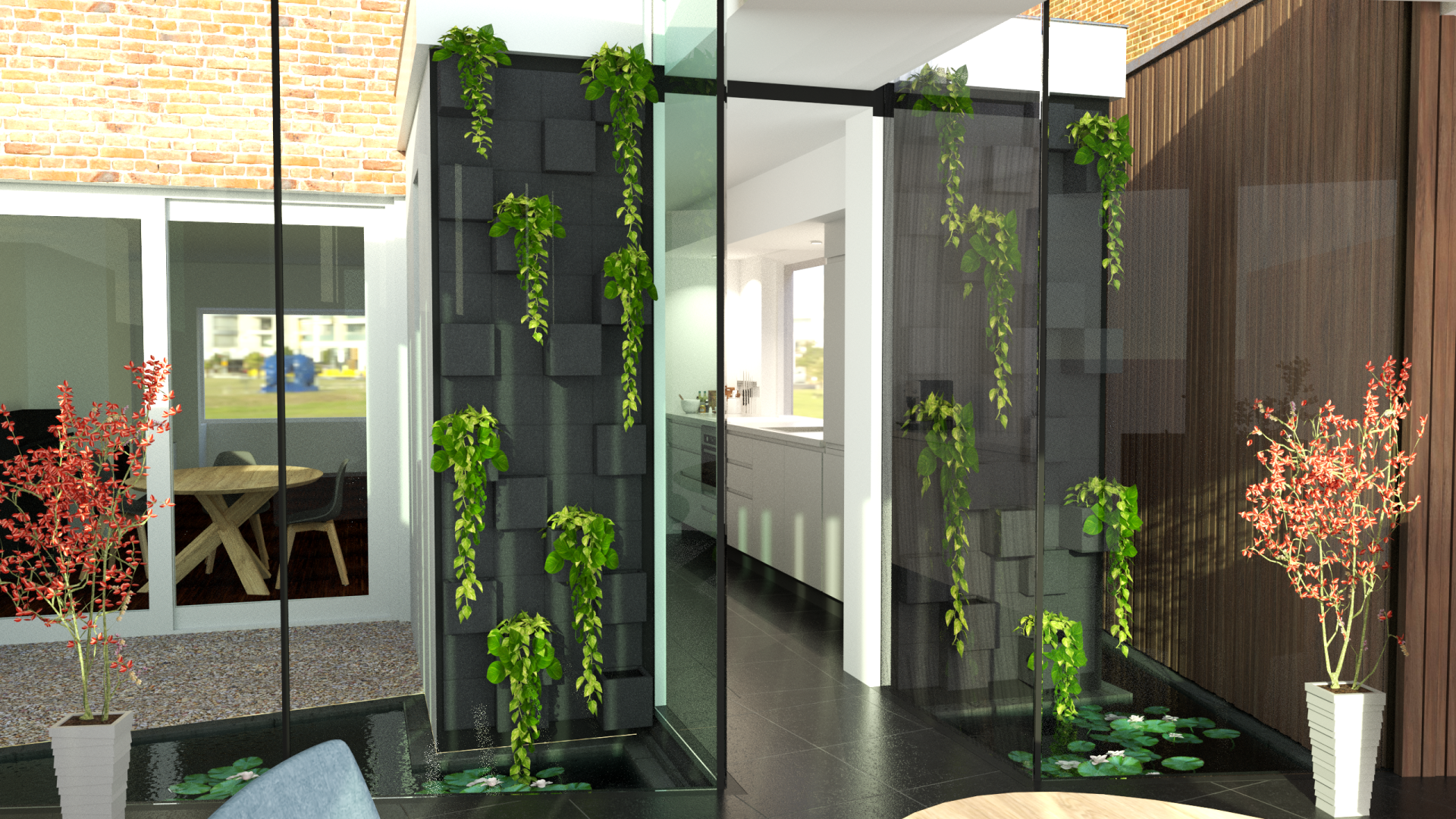 Door de buitenmuur van de keuken te voorzien van zwarte betonnen elementen van verschillende dieptes ontstaat er een mooi reliëf. Planten kunnen worden toegevoegd zoals weergegeven voor een mooie groene passage.