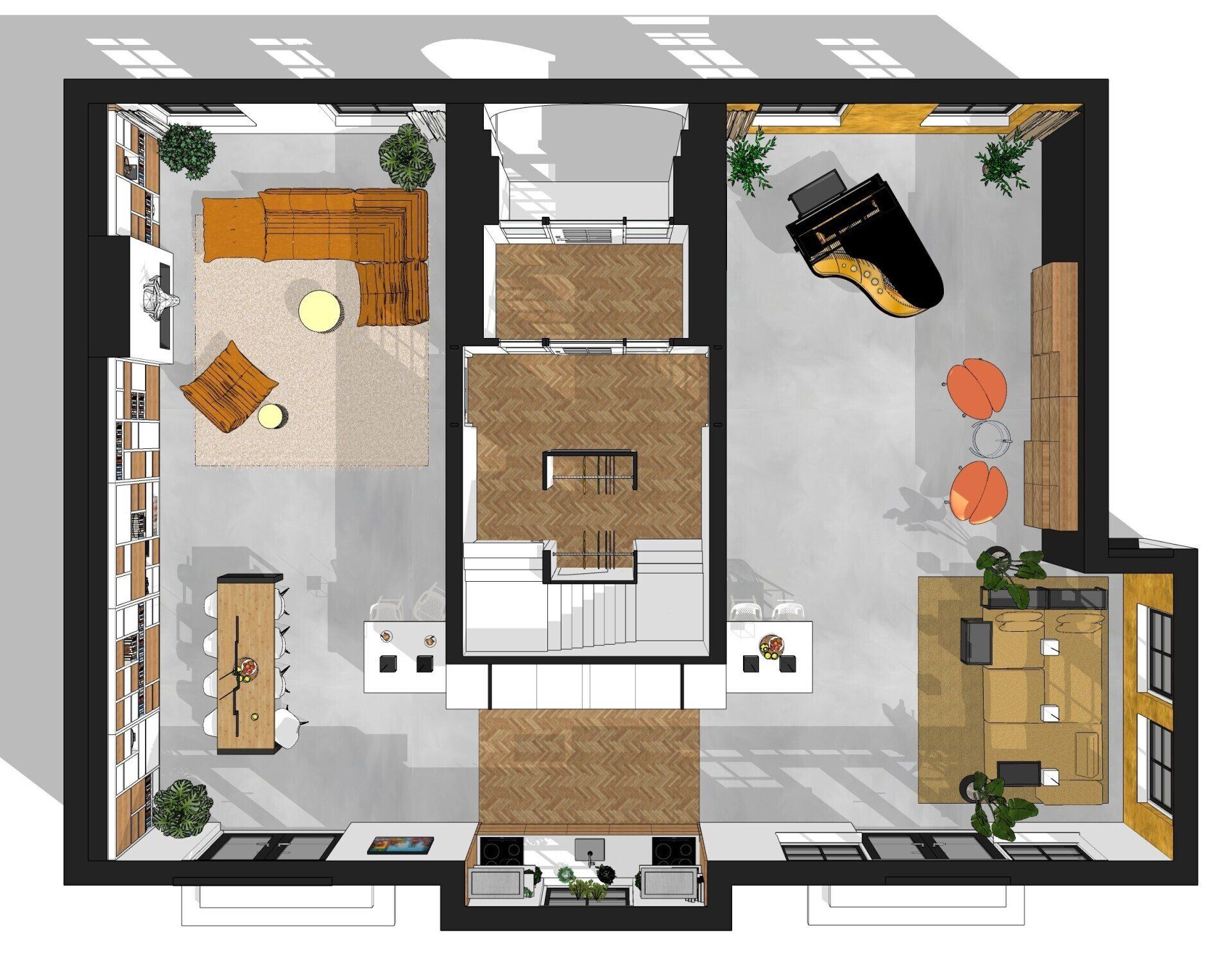 Op de vloer is zowel een gietvloer als deels een parketvloer aangebracht voor een industrieel maar warm en natuurlijk karakter.