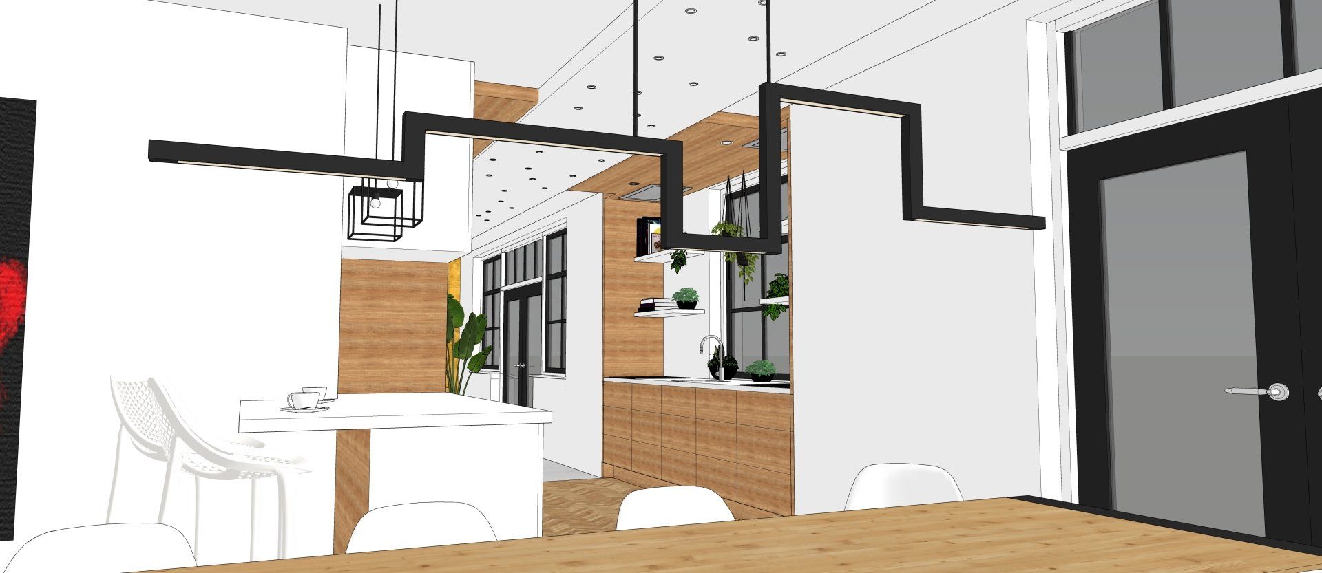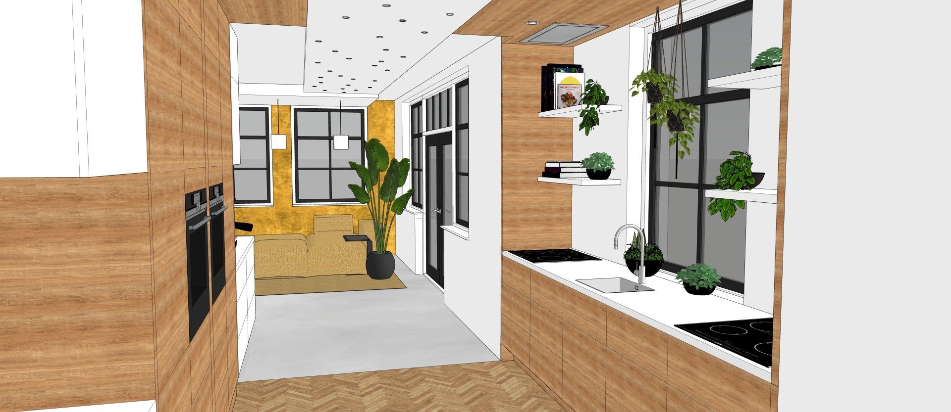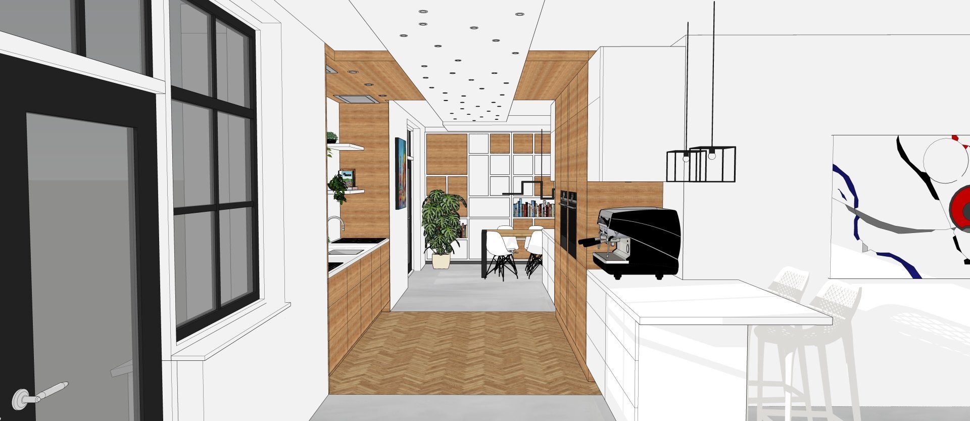 De keuken is aan de achterzijde geplaatst in de doorgang tussen de twee grote ruimtes.
