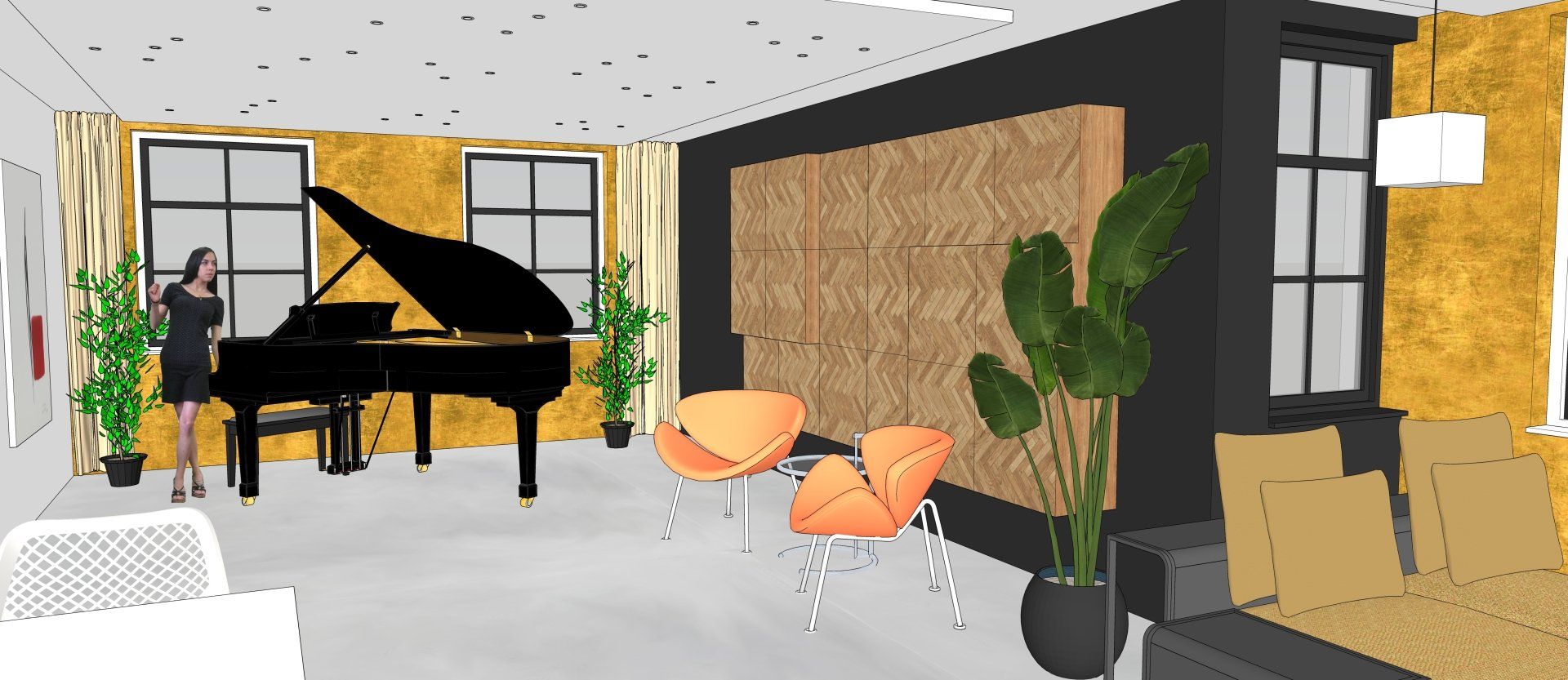 De muziekkamer herbergt de Bechsteinvleugel en is voorzien van een modulaire bank die tijdens muziekavonden dienst kunnen doen als losse zitelementen voor het bezoek. Een maatwerkkast biedt plaats aan diverse muziekinstrumenten. De wanden zijn voorzien van verweerd bronskleurig behang en donkere tinten.