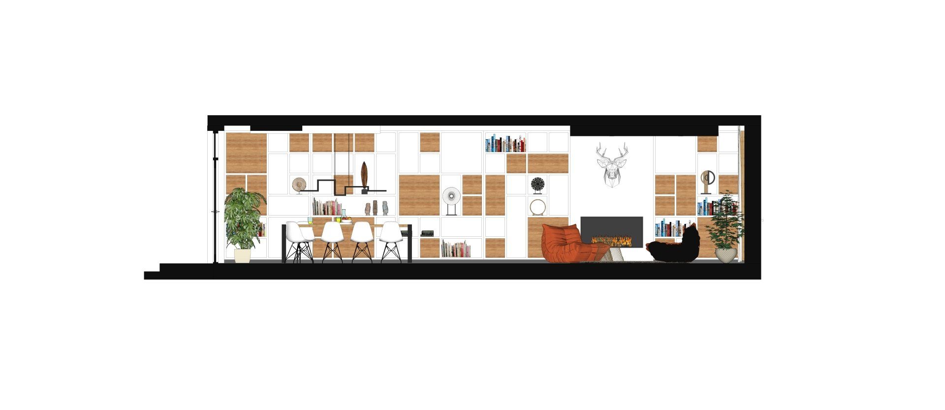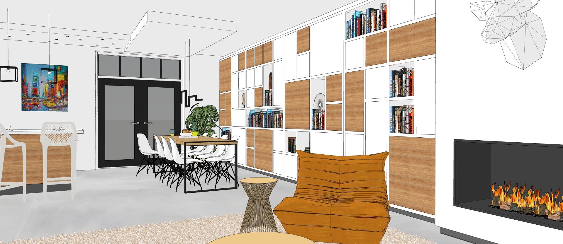 De woonkamer is voorzien van een eet- en woongedeelte voorzien van een openhaard. In de ruimte is een maatwerkkast aangebracht die voorzien is van een wisselend en zelf aan te passen patroon aan fronten.