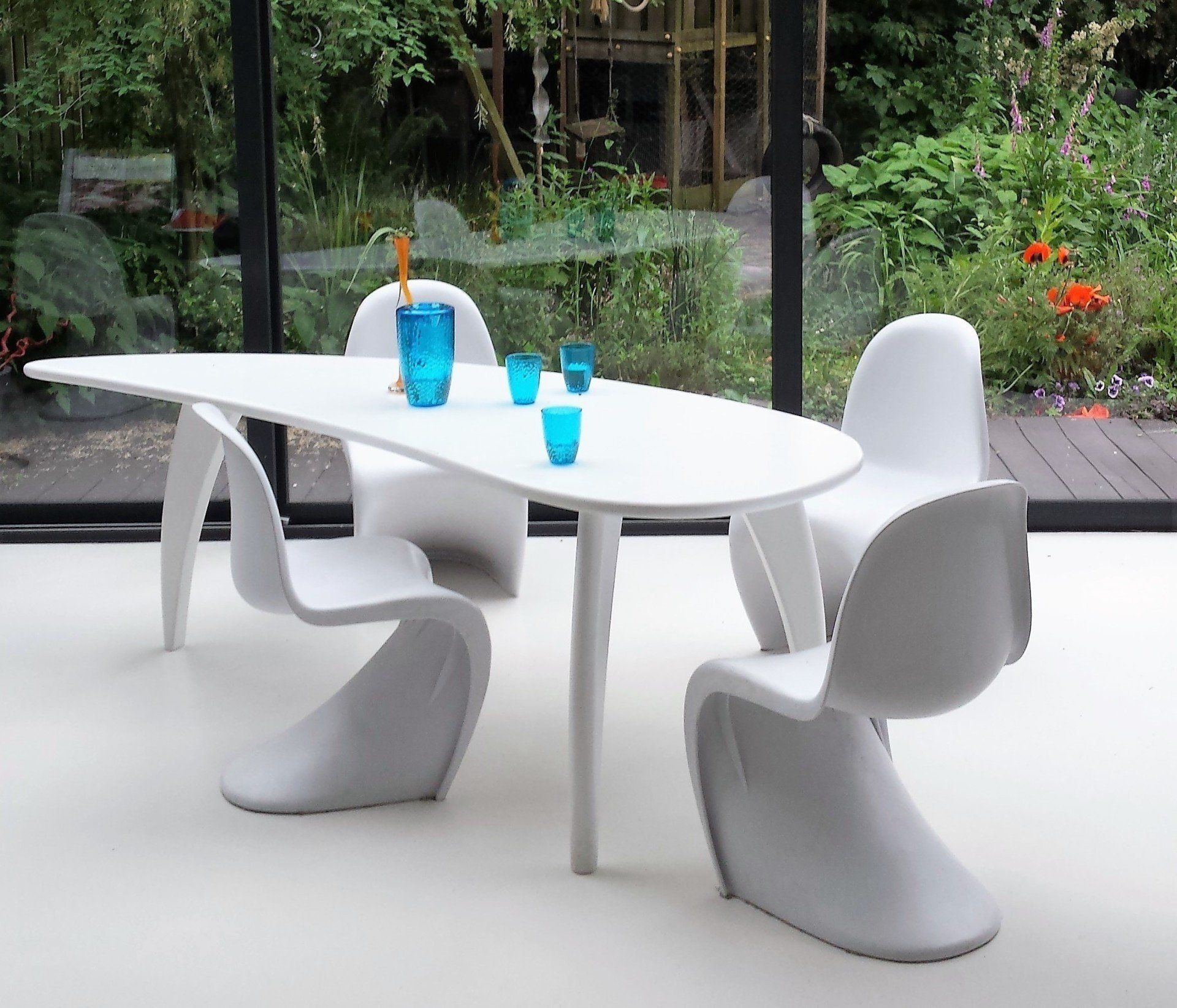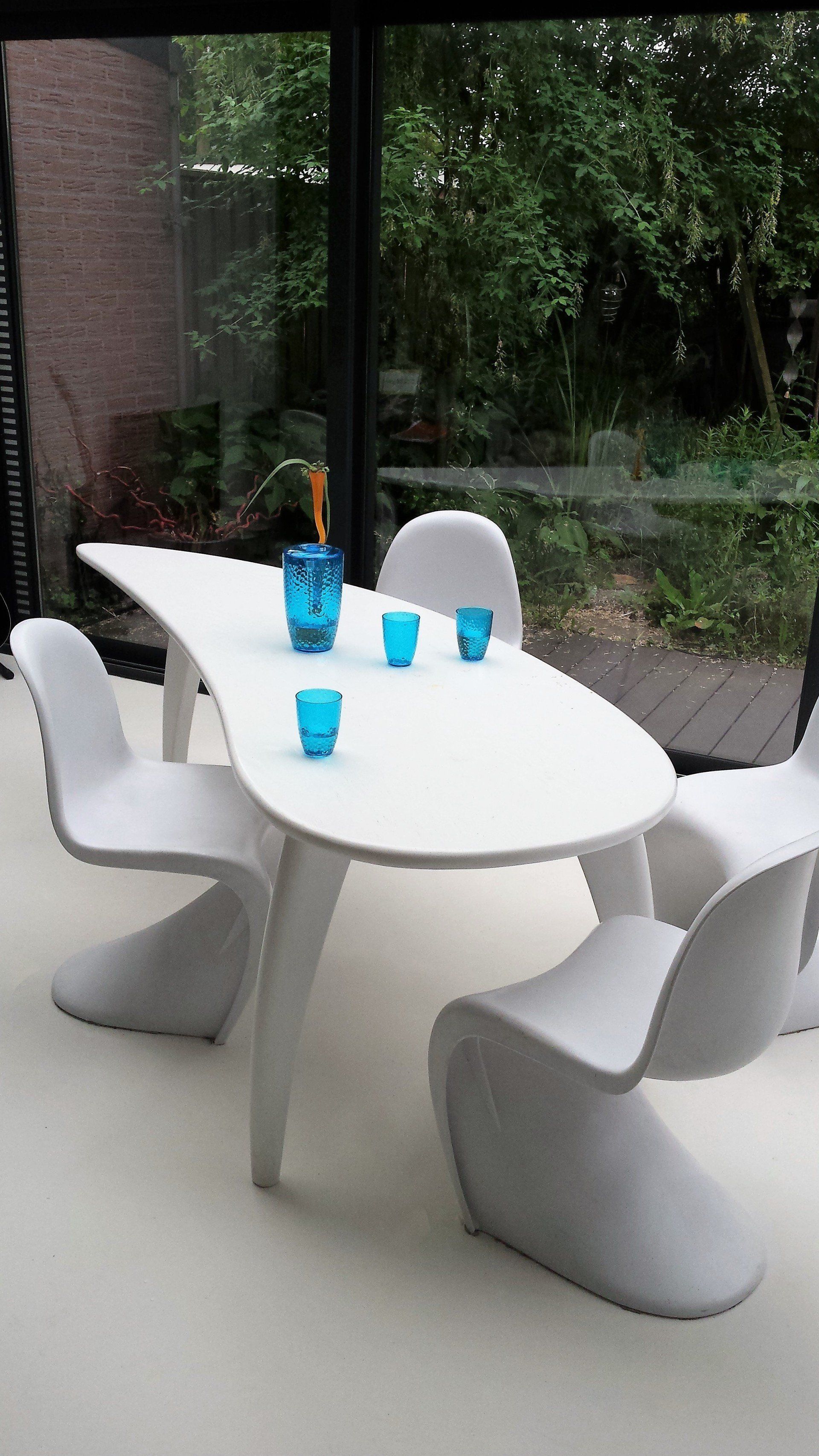 De tafel biedt plaats aan vier stoelen en is ontworpen met oog op de sierlijke lijnen van de Verner Panton stoelen.